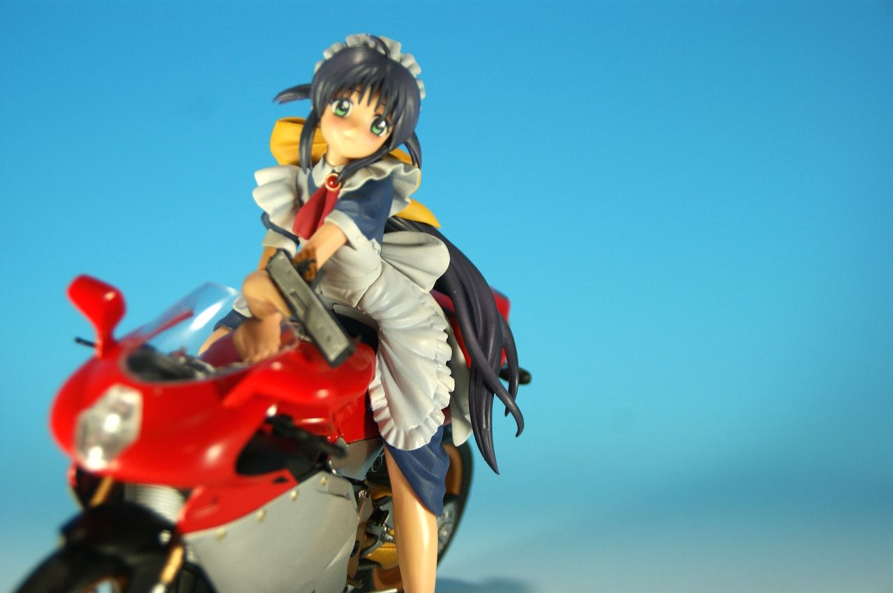 「まほろまてぃっく まほろさんとスポーツバイク (無免はいけないと思います!)Ver.」です。 今から四年半前の立体物で、当時の価格で一万円越え! とても買えませんでした・・・。 しかし半額にてでまんだらけで鎮座しておられたので、 長年の心のつかえを取るかのように、査収させていただきました。 まずは外箱。 光量が足らないのはご愛嬌。 箱もよれてたもので、こんなところで。 で中身は、 こんな感じ。 一つ一つ取り出してみると・・・ バイクが重いんですけど・・・・。 タイヤや車体の支えまできっちり動く! やばい物に手を出しちまったか? と思っちまいましたよ。 不器用な私は稼動物は苦手で・・・・・壊しそう。 恐る恐るバイクの素体を撮影。 なんかすごく綺麗。 俺メカ音痴だからさくっと撮影するかと思ったら、めちゃめちゃ楽しい。 これだけで金額の9割分のじゃねえか? と思えるぐらいでしたよ。 カウルをつけると・・・ 綺麗なんだけど・・・ああぁぁぁっ勿体無いなぁと感じてしまう。 まほろさんを乗っけると、 おおぅ!カッコいいなあ。とても四年も前の物とは思えないよ! 組み上げるとかなりちっこい作品ですが、 立体物の楽しみが凝縮された一品です。 今でも現役と張り合えるいいものでした!