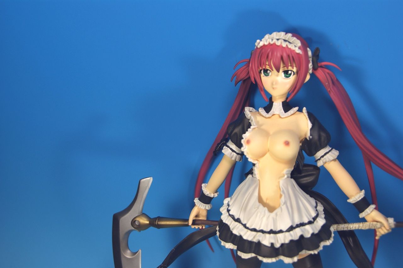あまりに接続部分がスカスカなので、やってしまいました・・・。 何で、あんな簡単に落っこちるんだよ~。 (ノω・、) ウゥ・・・ まぁ、大被害ってほどではないから、気を取り直して撮影開始。 大きな鎌とメイド服にツインテールが鉄板といえる特徴で破れた衣装がとても魅力的な娘さんです。 クィーンズブレイドの本は持っているけれど、あまり設定を知っていないんだなぁとあらためて確認。 ゲーム用の本と漫画の登場数コマしか読んでいないので、今度小説でも読んでみよう。 お顔アップ~♪ かなり挿絵などより凛々しいお顔かな? 好き嫌いが分かれる造詣かもしれませんが、許容範囲かと。 ちょっと、メイクが濃い感じも。 体型を見ると妙に生々しく感じる、細めのウエストや腕のラインに比べ、 胸やおへそのラインにメリハリがあるので、 破れた服の微妙な隠れ加減と合わさって えちぃ具合が倍増してます。 チラリズムの効果でしょうか? 両手で持つ大鎌は、とても質感のある塗り方をされているようです。 美少女に大きな武器はいいものですね~。 三方向から。 どの方向から撮ろうか、ちょっと迷うかな? このアイリは 胸のリボンと服のカケラが外れるようになっているので、 しっかり胸が確認できるようになります。 破片部分が小さいから、あんまり変わんないかも。 あえて言うならなら胸よりも・・・・、 スカートと体の隙間のほうが、かなりえちぃかと・・・フェチジャナイヨ? 。 ちなみに下着の造型。淡い水色でした ちゃんと中の下着も破れているんだなぁ。 以上、「グリフォン 冥土へ誘うもの アイリ」でした。 とにかく、脱衣パーツは安定しないし、差込パーツが緩々だし、 自立も危なくて出来ない。 撮影や飾ることに関しては、大変不安で苦労する、一品でした。 ・・・・開封しちゃったけど、どうしよう・・・。箱に戻すのも怖いですよ。