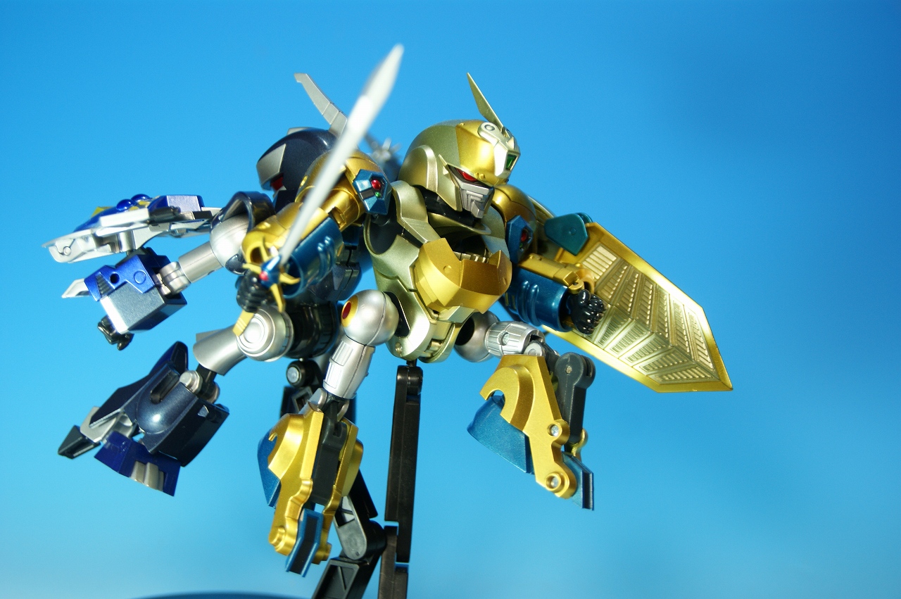 今日はメガハウスから発売されたヴァリアブルアクション クィーンサイダロンを開封。 まず箱から。 書き下ろしイラストがとてもカッコいいです。 以前発売された、ヴァリアブルアクション キングスカッシャーと左右対称の構図ですね。 中身は~、 クィーンサイダロンの素体に、持ち手、槍に鞭に盾。 そして、今回のために作成された、クィーンサイダロンのコインが目を引きます。 このコインは、先代勇者サイダーが使っていたという設定でしょうね。 中を空けて、ぐるりと一周。 「ジュワッ!」 光沢がとても綺麗です。守護騎士といわれるのも納得の質感です。 胸の飾りが全体的に下側になってしまっているのは寂しいところです。 ちょこっと遊んでみましたが、鞭が寂しいですね造型といい長さといい。 基本的には槍で遊んでしまいそうです。 キングスカッシャーの時も、ブーメランやハンマーでは遊ばなかったな・・・。 では、変形させましょう。 「血圧アーップッ!! やぁぁっってやるぜ!ヤリパンサー!」 やはり、差し替えほぼなしでここまで変形できるのは圧巻ですね。 差し替えをしている盾もTVアニメで完全に浮いて付き直してたからパーフェクトです。 やはり、キングスカッシャーとそろえて、 「ロイヤル・スカッーッシュ!」 ・・・と、コレはやらないとね。 にしても、必殺技まで飲み物を彷彿とさせるネーミングとは・・・・、徹底してたなぁ。 とにかく、 コレは2体同時に置いておくべきでしょう。 金色や黒光りが良く栄えます。 ココでは、このセットで。 (゚∇゚*) 以上、ヴァリアブルアクション クィーンサイダロンでした。 メガハウスさんには、この勢いでブレンドンを!ゼンザインをー! ポーン八兄弟なんてワガママ言わないからーっ