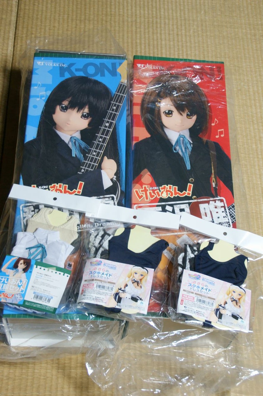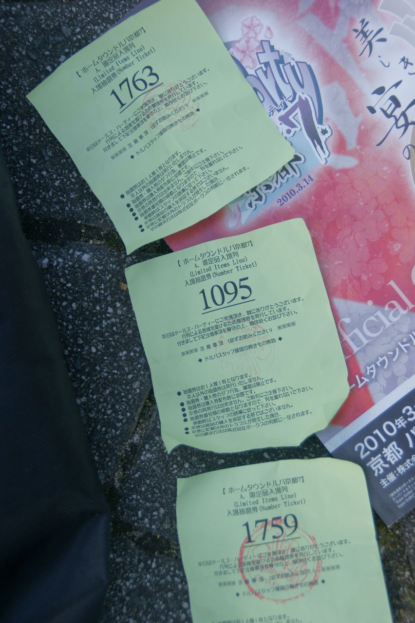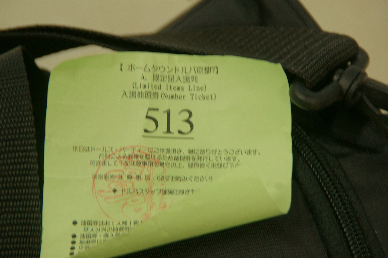 名古屋駅を6時20分発です。 今回職場から直行でした。家から出発ですと・・・この1時間ほど後のしか乗れないかな? 今回は限定列のクジに参加できそうですね♪ ・・・・・というか、大阪、東京では朝一の電車では抽選に参加できない落とし穴。 これがドルパ参加のネックなんですよね。参加する意義の半分がなくなるので・・・・。 ということで、えっちらおっちらと・・・・ いやぁ・・・迷った迷った。 竹田駅降りてから目印が全然無いんだもの。 さて、会場に着いたので、 弾次朗さん、さくゆたさん、ルカさん、シバいぬさんとご挨拶♪ シバいぬさんからお願いしていたものも受け取りました! シバいぬさん、ありがと~! そして、いそいそと限定列抽選へと並びます・・・・すると・・・・ Twitter上で【雪山オフ】でお世話になったりんつさんが同じ列にいるとのこと・・・・ 「どこ~!どこ~っ!!」 と探し回っていたのですが・・・・・すぐ隣にいましたw (後で気付きました・・・) さて、限定列抽選のほうなのですが、今回の勝負回数は4回! 前回のさーりゃんで大敗しているのでガイドブック四冊で参戦です! で・・・・ 1回目1095番・・・・(TΔT) 2回目1759番・・・・。:゚(。ノω\。)゚・。 3桁が出ません・・・・ そして2回目が終わった時点でりんつさんと合流。 りんつさんの引いた番号は・・・・ 513番!!! にゃにゃにゃ、にゃんですと~!!! うらやましすぎる! これは、いい番号だ!まず限定DDは手に入るであろう良い番号です! ということで、この私のヘタレハンドに変わって、 りんつさんのゴッドハンドのお力をお借りすることに。 んでもって、りんつさんを巻き込んで残りの2回を1人1回づつ引く。 結果・・・・・・ 1763番!・・・・・・・ ウワァァ-----。゚(゚´Д`゚)゚。-----ン!!!! もう、自分の駄目さ加減がいやになりましたよ・・・・ 何のために複数冊購入しているんだか。 で、りんつさんの引いた番号を見てみると・・・・・・ 310番! きらり~ん☆ (写真は撮り忘れたのでりんつさんのBlogで見てね。) 。+゚(*´∀`*)。+゚ Σ(ω・`/)/ 神様っているんだね・・・・すっごいえこひいきするけど。 ということで、りんつさん先程引いた513番と交換してもらうことに。 ありがとうございます~! という感じでりんつさんと限定列待機場所に行ってみるとました。 今回もやはり全体の抽選番号は4000番だったみたいです♪ ここで、【里オフ】でお世話になったたにひめさんと、 雛菊の生みの親であるx_rime_x(らいむ)さんに合流。 限定物の引換券受け渡しとなったのですがとりんつさん310番で ツイッタードール部の方々はお目当てをすべてお迎えできたようです♪ ほんとにありがとう、りんつさん。すごいよ! という事で、私がお迎えしたのはこちら! DD平沢唯、秋山澪、夏服セット、スク水メイドセットをお引取りできました! え?スク水メイドセットが2つあるって? 細かいことはいいじゃない♪