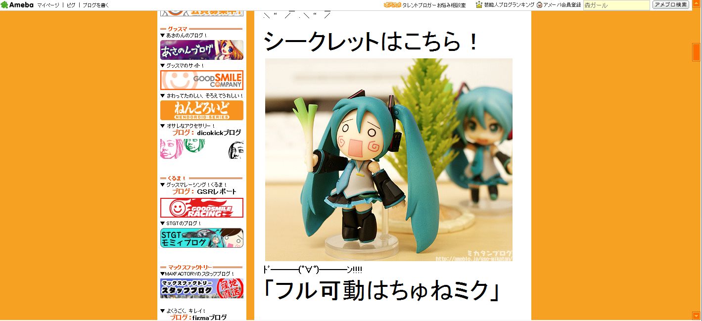 ミカタンブログさんで公式発表になったようですが、シークレットが、 「フル可動 はちゅねミク」 だそうです! サイトの写真を見るだけでもガッツガッツに動いてます! やべぇ、すっごい欲しい。 予約してあるけど、遅かったので2次出荷分かもしれない・・・・。