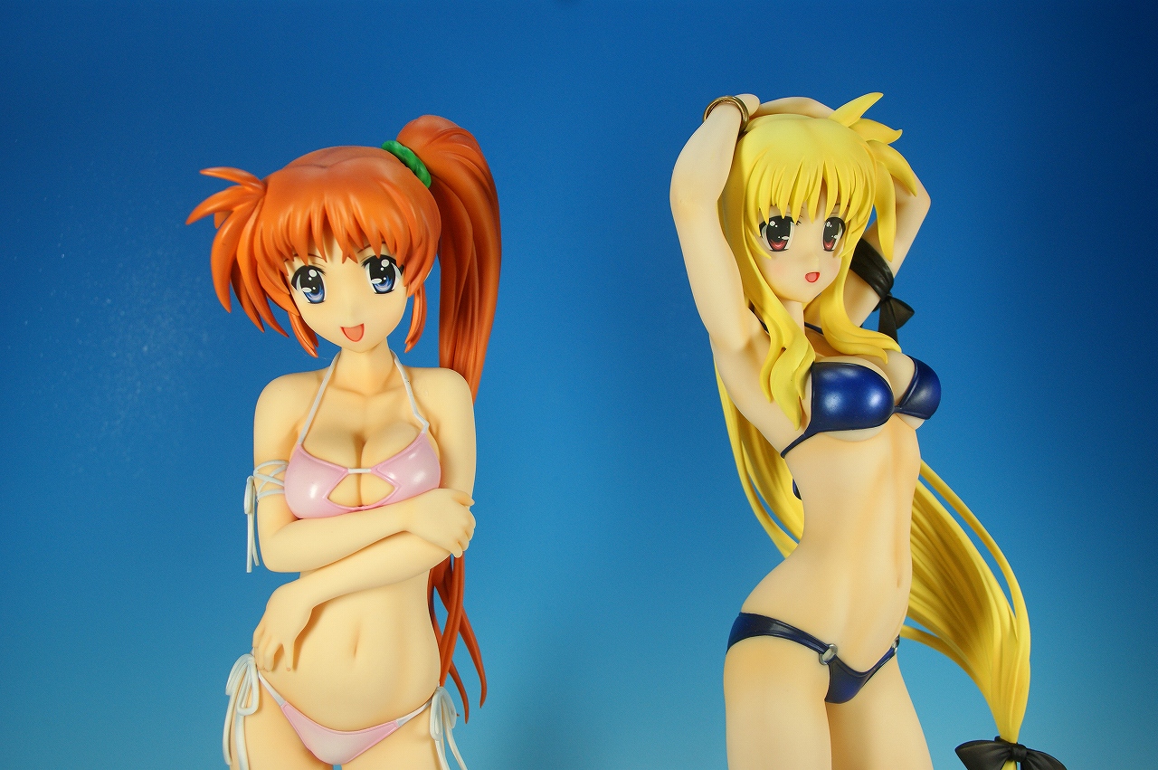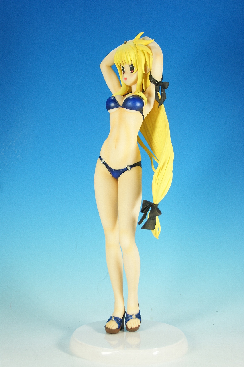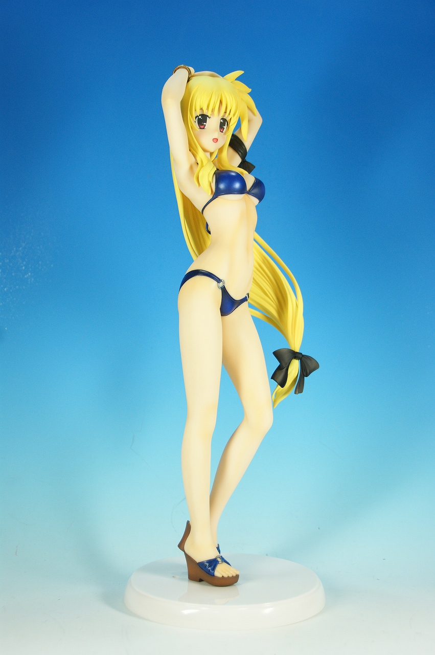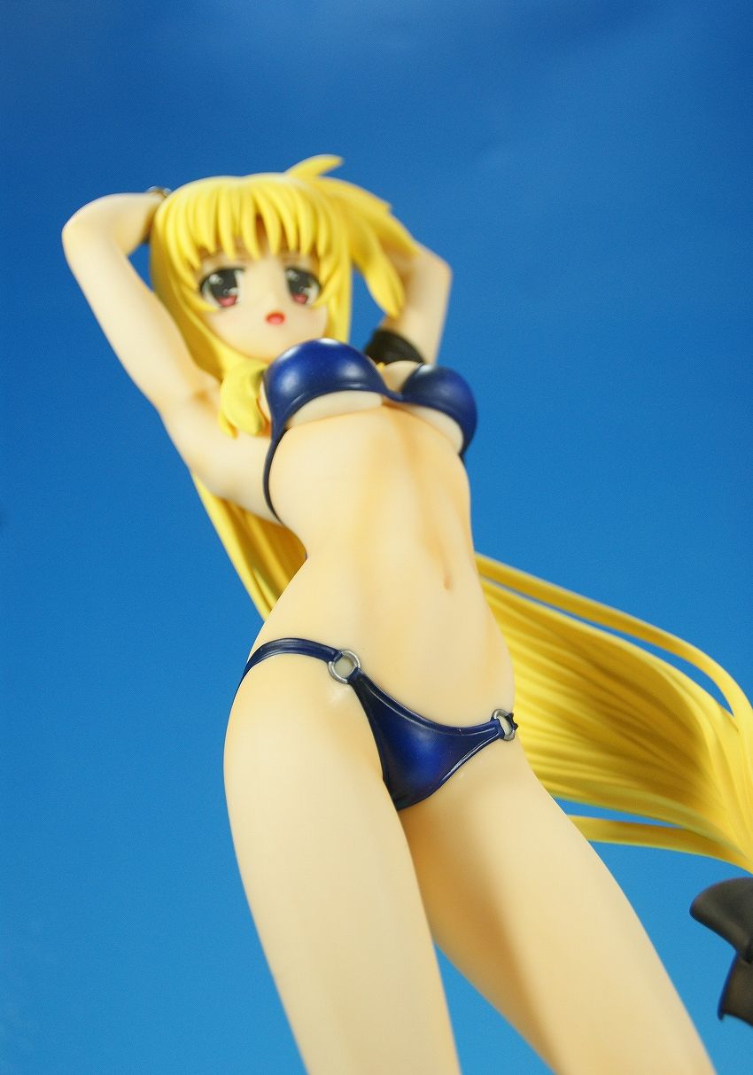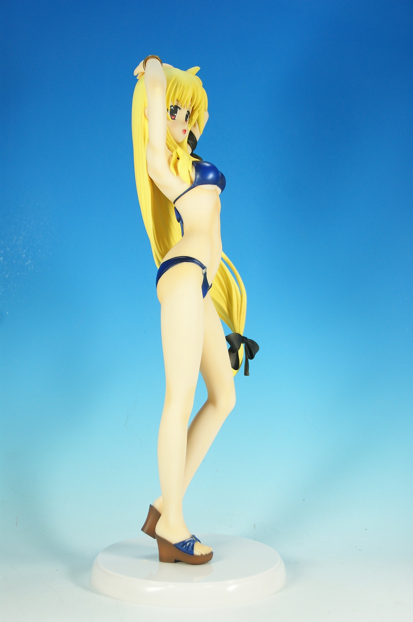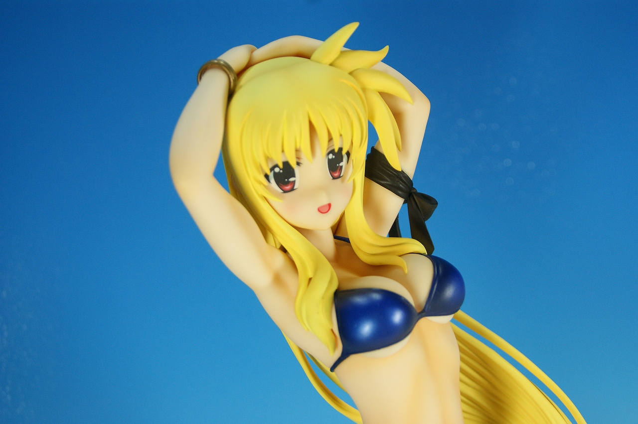 「魔法少女リリカルなのはStrikerS フェイト・T・ハラオウン 水着Ver. 」を開封! 前回のなのはさんの発売からもう5ヶ月近くたつのですね・・・・・。長い・・・・長かった。 では、早速 箱から~! 前回のなのはさんのパッケージと統一感を持たせたデザインです。 なのはさんが、ピンクのラインに黄色のシルエットだったデザインの対照的に、 フェイトさんは、黄色のラインにピンクのシルエットです。 では、箱腹出してぐるりと一周~♪ キャラクターの特性上(髪の毛)、見る方向が限定されますが、 体の出来は圧巻の一言です。 このボディでまだ19歳なんて・・・・すごいよ! ちょっとアップで♪ フェイトさん、可愛いです~♪ サイズがサイズなので、髪の毛がちょっとだるく感じるかもしれません。 胸の張りがすごいです。わきの下の造形も綺麗に作られていますね。 髪の毛に隠れがちな、背中や肩甲骨、お知りのラインも美しく見せてくれます。 フェイトさんの水着、ローライズだよ~。目のやり場に困っちゃいますね。 なのはさんの時もそうでしたが、全体的に体のグラデーションが美しいです。 手や、 足の爪先にも、薄く彩色が。こういったところも好感度高いです。 下からのアングルだと、下乳が大変なことに! 水着で圧迫されて、あの大きさってことは・・・・。 最後になのはさんと一緒に。 ホントはもっと近くによせたかったけれど、台座の関係上、これが限界。 ビックサイズで飾る場所が大変なことや、角度限定な所は難点ですが、 それに見合った存在感。素晴らしい出来栄えでした。 以上!「魔法少女リリカルなのはStrikerS フェイト・T・ハラオウン 水着Ver. 」でした。