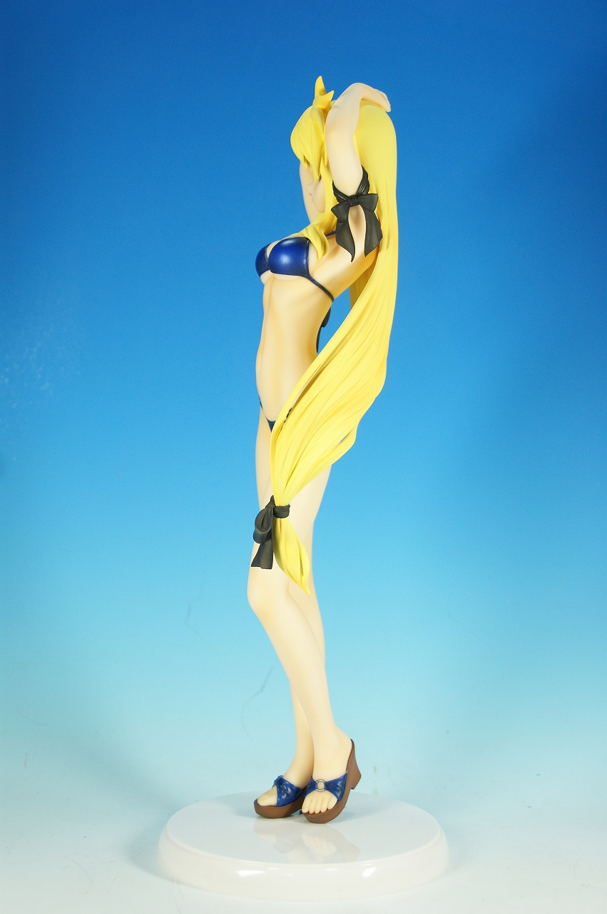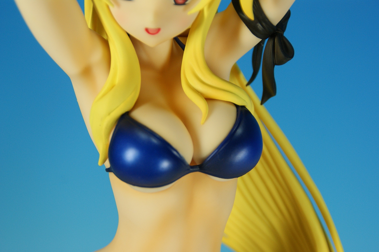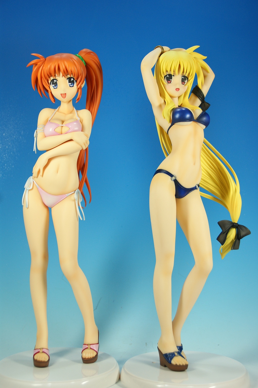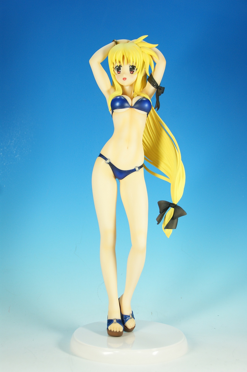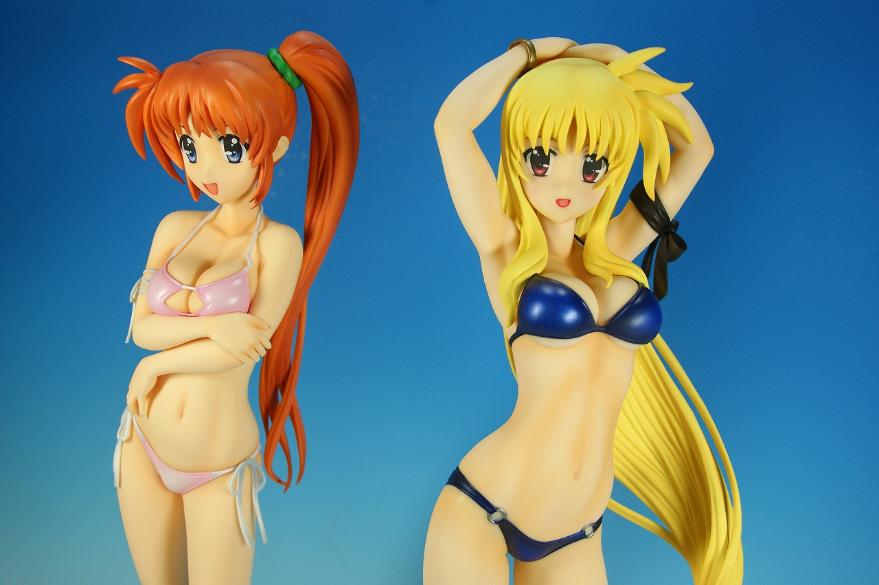 「魔法少女リリカルなのはStrikerS フェイト・T・ハラオウン 水着Ver. 」を開封! 前回のなのはさんの発売からもう5ヶ月近くたつのですね・・・・・。長い・・・・長かった。 では、早速 箱から~! 前回のなのはさんのパッケージと統一感を持たせたデザインです。 なのはさんが、ピンクのラインに黄色のシルエットだったデザインの対照的に、 フェイトさんは、黄色のラインにピンクのシルエットです。 では、箱腹出してぐるりと一周~♪ キャラクターの特性上(髪の毛)、見る方向が限定されますが、 体の出来は圧巻の一言です。 このボディでまだ19歳なんて・・・・すごいよ! ちょっとアップで♪ フェイトさん、可愛いです~♪ サイズがサイズなので、髪の毛がちょっとだるく感じるかもしれません。 胸の張りがすごいです。わきの下の造形も綺麗に作られていますね。 髪の毛に隠れがちな、背中や肩甲骨、お知りのラインも美しく見せてくれます。 フェイトさんの水着、ローライズだよ~。目のやり場に困っちゃいますね。 なのはさんの時もそうでしたが、全体的に体のグラデーションが美しいです。 手や、 足の爪先にも、薄く彩色が。こういったところも好感度高いです。 下からのアングルだと、下乳が大変なことに! 水着で圧迫されて、あの大きさってことは・・・・。 最後になのはさんと一緒に。 ホントはもっと近くによせたかったけれど、台座の関係上、これが限界。 ビックサイズで飾る場所が大変なことや、角度限定な所は難点ですが、 それに見合った存在感。素晴らしい出来栄えでした。 以上!「魔法少女リリカルなのはStrikerS フェイト・T・ハラオウン 水着Ver. 」でした。