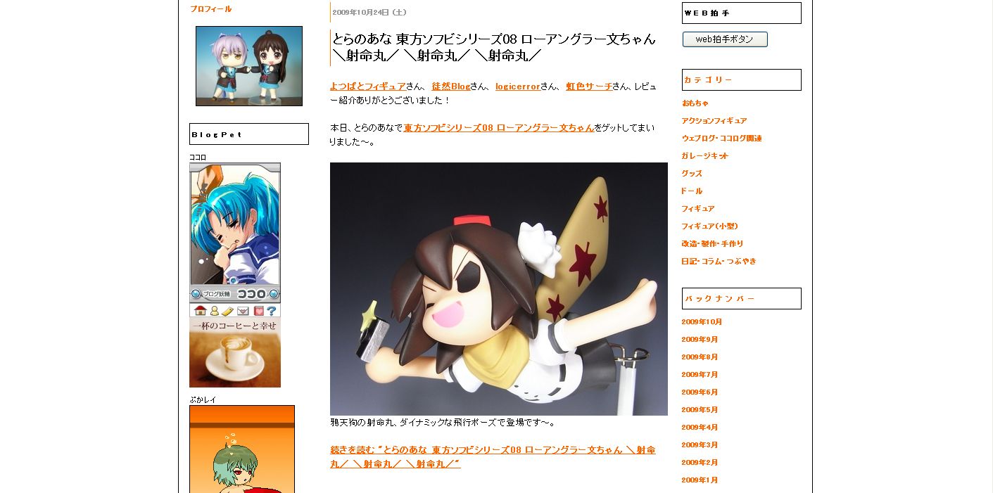 hobby-toy-webさんのところで とらのあな 東方ソフビシリーズ08 ローアングラー文ちゃん \射命丸/ \射命丸/ \射命丸/ 文ちゃんのレビューが有りました!こいつは美しい飛行形態! ドール用支柱を使えばこんなにかっこよく飛ばせるのか~。と眼からウロコ。 ちなみに私も「ぶんちゃん」「ふみちゃん」と呼んじゃってました。 あ~、たしかに「あやちゃん」と読めるわ・・・・・orz たいたんnoページさんでは AZONE 2009年11月の新商品 AZONEの新商品情報があったので個人的にメモメモ。 それにしても、「えっくす きゅーと Classic Alice koron Amazon.co.jp限定 」の 注文が復活する気配も無い・・・・・orz
