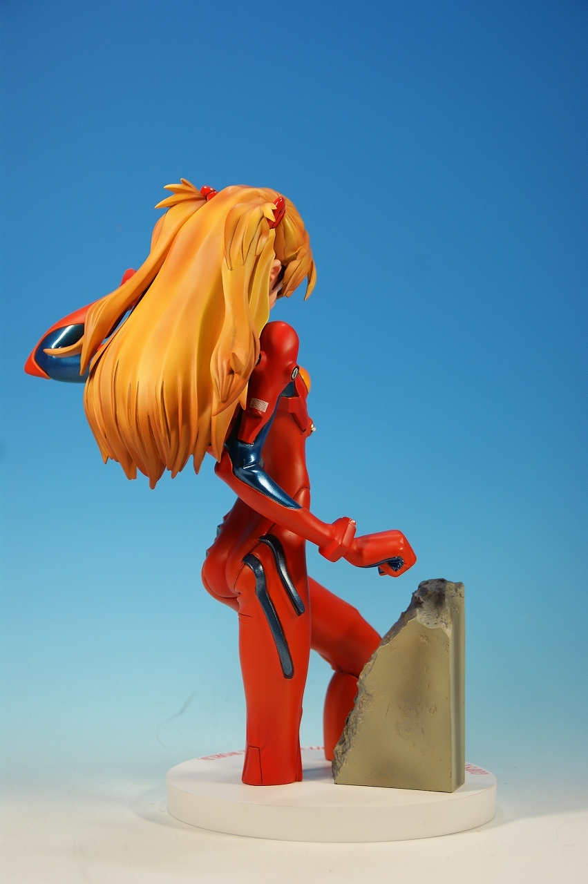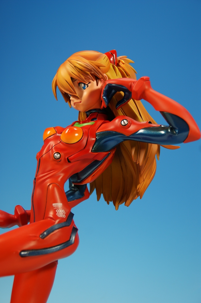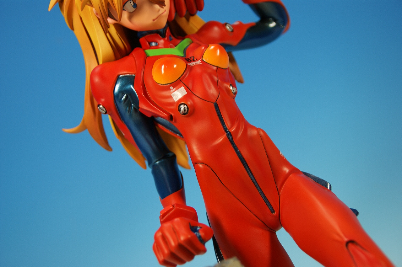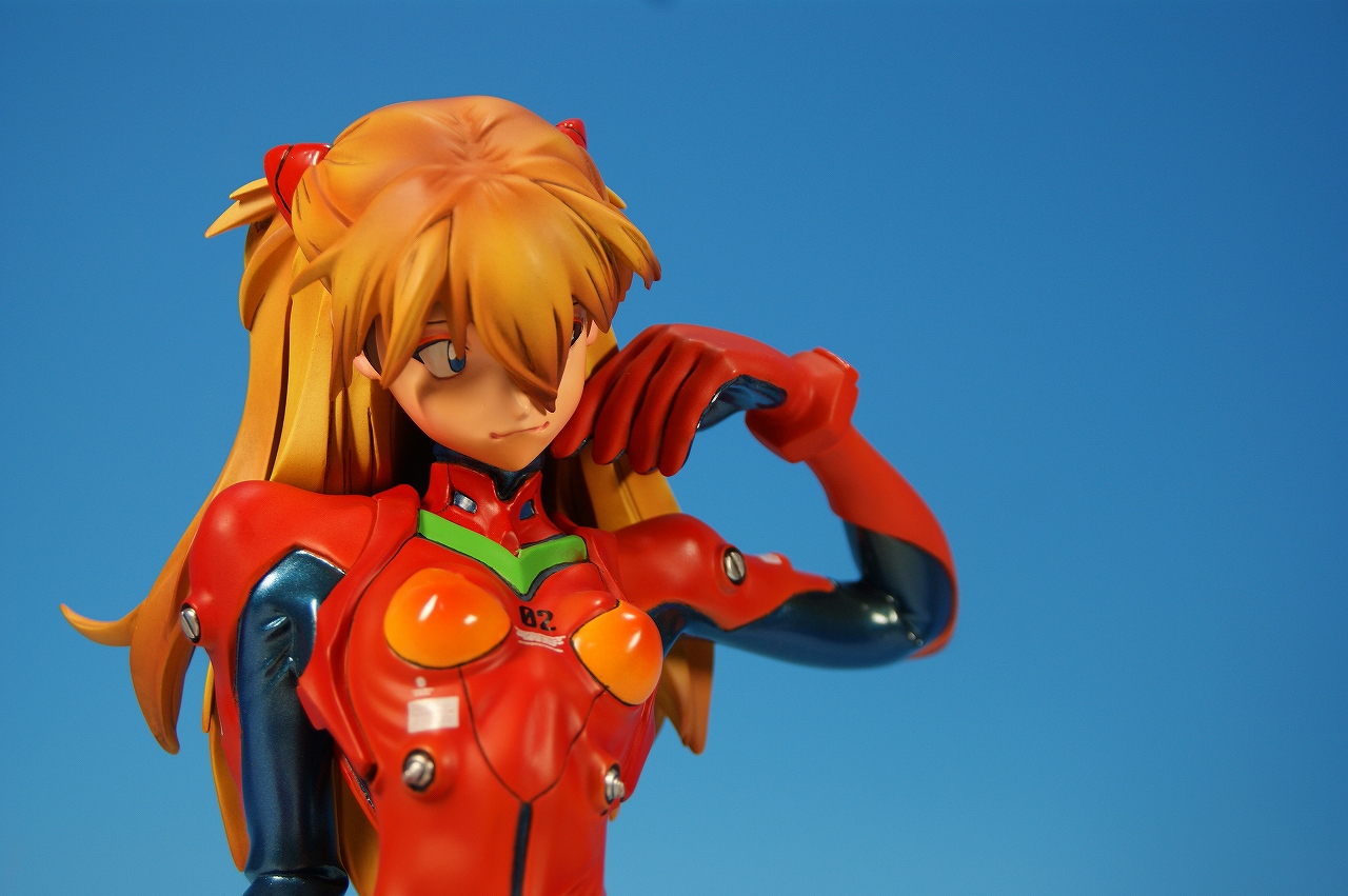 「惣流・アスカ・ラングレー」を開封! 原型は軽音堂の臼井政一郎 氏。 ここのところエヴァ熱が発動気味な上、ちょっと変わった物がいいなぁなんて気持ちがあった折に、 ほんの少々お買い得チックな物品があったので、サクッと収集しちゃいました。 勢いだけで購入したことについては反省しているけれど後悔はしてない。 うん、後悔していない! 海洋堂っていうと、ガレージキット全盛時代には、キャラ物を沢山販売していたけれど、 PVC完成品全盛になるころからキャラ物なんて、 まともにお目にかかっていないイメージがありますね。 いまでは「リボルテック」ぐらい?これだってロボメインのイメージがあるもんなぁ・・・と。 では、外箱は、こんな感じ~♪ 白い箱にシールのみです。 当時の立体物の箱って、こんなものだったよね。普通の玩具屋には、まずありませんっていう感じ。 こういった無味無臭な梱包のものは一部のコアな人向けって印象になっちゃいますね。 では、グルリと一周! サイズは1/4。脹脛より上の半身像ですね。 プラグスーツの特性上、体のラインがキッチリ出ます。 腰やお尻のライン、二の腕などの曲線がとても美しい出来ですね。 表情はアスカの原型を残しつつも、かなりのアレンジが加えられているように感じます。 全体的に日本人らしくない不遜ともとれるような表情でアニメ、漫画版にはまず無い表情です。 が!アスカならこの表情のありかな?と思えてしまう。ちょっと不思議。 ホント、どの角度から見ても見応えありますね! プラグスーツの細かい部分もシッカリした仕上げがされているし、 大きい物特有の単調さも特に見当たりませんね。 以上、海洋堂の新世紀エヴァンゲリオンの「惣流・アスカ・ラングレー」でした♪ これは結構前の商品だと思うのですが、今見ても全く見劣りしませんね。素晴らしい! 勢いだけで購入しても、この出来なら後悔は出来ないです。