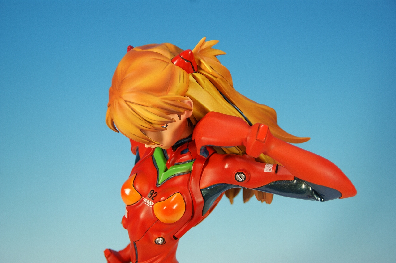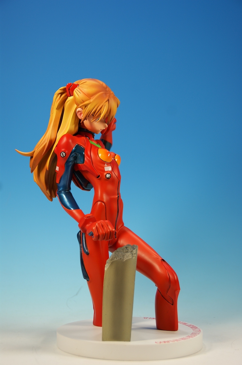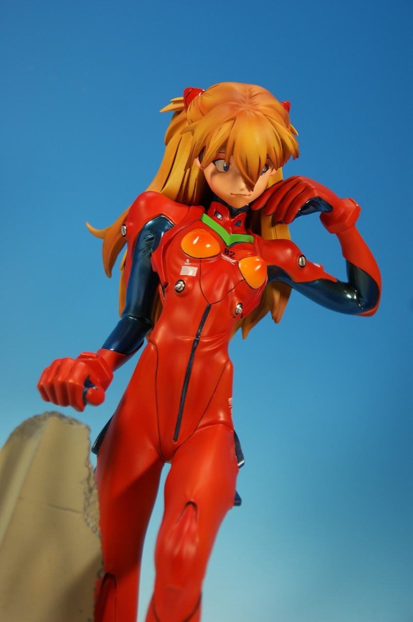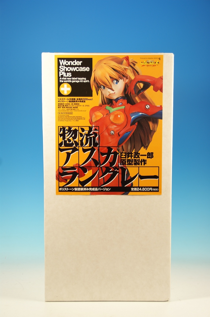 「惣流・アスカ・ラングレー」を開封! 原型は軽音堂の臼井政一郎 氏。 ここのところエヴァ熱が発動気味な上、ちょっと変わった物がいいなぁなんて気持ちがあった折に、 ほんの少々お買い得チックな物品があったので、サクッと収集しちゃいました。 勢いだけで購入したことについては反省しているけれど後悔はしてない。 うん、後悔していない! 海洋堂っていうと、ガレージキット全盛時代には、キャラ物を沢山販売していたけれど、 PVC完成品全盛になるころからキャラ物なんて、 まともにお目にかかっていないイメージがありますね。 いまでは「リボルテック」ぐらい?これだってロボメインのイメージがあるもんなぁ・・・と。 では、外箱は、こんな感じ~♪ 白い箱にシールのみです。 当時の立体物の箱って、こんなものだったよね。普通の玩具屋には、まずありませんっていう感じ。 こういった無味無臭な梱包のものは一部のコアな人向けって印象になっちゃいますね。 では、グルリと一周! サイズは1/4。脹脛より上の半身像ですね。 プラグスーツの特性上、体のラインがキッチリ出ます。 腰やお尻のライン、二の腕などの曲線がとても美しい出来ですね。 表情はアスカの原型を残しつつも、かなりのアレンジが加えられているように感じます。 全体的に日本人らしくない不遜ともとれるような表情でアニメ、漫画版にはまず無い表情です。 が!アスカならこの表情のありかな?と思えてしまう。ちょっと不思議。 ホント、どの角度から見ても見応えありますね! プラグスーツの細かい部分もシッカリした仕上げがされているし、 大きい物特有の単調さも特に見当たりませんね。 以上、海洋堂の新世紀エヴァンゲリオンの「惣流・アスカ・ラングレー」でした♪ これは結構前の商品だと思うのですが、今見ても全く見劣りしませんね。素晴らしい! 勢いだけで購入しても、この出来なら後悔は出来ないです。