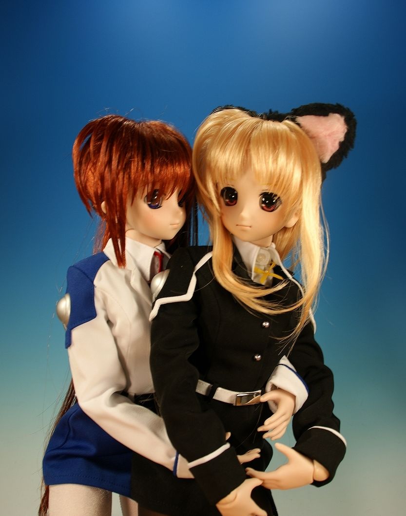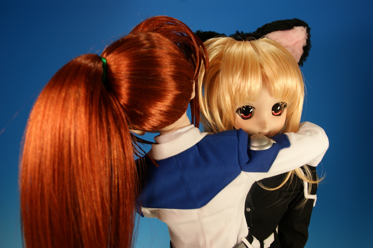 フェイト 「あれっ・・・?無いなぁ。置いてきちゃったかな?」 なのは 「どうしたの?フェイトちゃん。」 フェイト 「え・・・・あぁ・・・・うん、ちょっと執務官室に忘れ物をしたみたいなんだ。」 なのは 「それじゃあ、戻らないとね。」 フェイト 「うん。ごめん、なのは。取ってくるから、少し待っててくれるかな?」 なのは 「いってらっしゃい、フェイトちゃん。気をつけてね。」 フェイト 「うん、ホントにごめん。すぐ戻るから。」 パタタタタタタタッ! (足音) なのは 「・・・・・・・・ふふっ。」 ~執務官室に到着~ フェイト 「えぇっ・・・と、あった、あった。 さすがに職場にコレを置きっ放しって訳にもいかないからね・・・・・・ん?」 フェイト 「コレは、ネコミミ・・・・だよね・・・・。何でこんなところに・・・・・?」 もふもふもふもふ・・・・・・ フェイト 「結構、ふかふかしてるんだな・・・・・。」 フェイト (・・・・・・・・キョロ・・・・・・キョロ・・・・・・) 「誰もいない・・・よね・・・・・。」 フェイト 「えへへへっ。どうかな?似合う・・・・かな?」 バタンッ! フェイト (ビクゥッ!!!) なのは 「フェイトちゃ~ん。どうかな~?忘れ物見つかったかな~?」 フェイト 「な・・・・なの・・・・は・・・?」 がばっ! なのは 「ああ~っ!フェイトちゃん、ネコミミつけてる~♪ フェイトちゃんはやっぱりネコミミがよく似合うね~♪」 フェイト 「え?なに?なんで・・・・・???」 なのは 「ごめんね、フェイトちゃん。 実はフェイトちゃんがネコミミを持ったらどういった反応をするのかな~?って 気になっちゃったものだから、ちょっと・・・・ね。」 フェイト 「むぅぅぅ・・・ひどいよ、なのは~っ」 なのは 「本当にごめんね、フェイトちゃん。 でも、そ~っとネコミミを付ける可愛らしいフェイトちゃんが見たかったの♪」 フェイト 「次からは、こんな事しちゃダメだよ、なのはっ!」 なのは 「は~いっ。えへへっ。」 フェイト 「もう・・・・っ、なのはが素直に見たいって言えば私だって・・・・・・ゴニョゴニョ」 なのは 「ん?フェイトちゃん、何か言った?」 フェイト 「な・・・・ななな、なんでもないよっ!」 という感じで、「けいおん!」のネコミミ話をなのはさんとフェイトちゃんで リスペクトしてみたんですが・・・・、 何故この娘さんたちはイチャイチャしちゃうんでしょうか・・・・? 作成当初は、本当にストーリーをなぞらえるつもりだったのに、百合成分が暴発しちゃいます。 ・・・・・でも、百合チックな創作は美しいですね~。やってて楽しいわ。コレは。 |