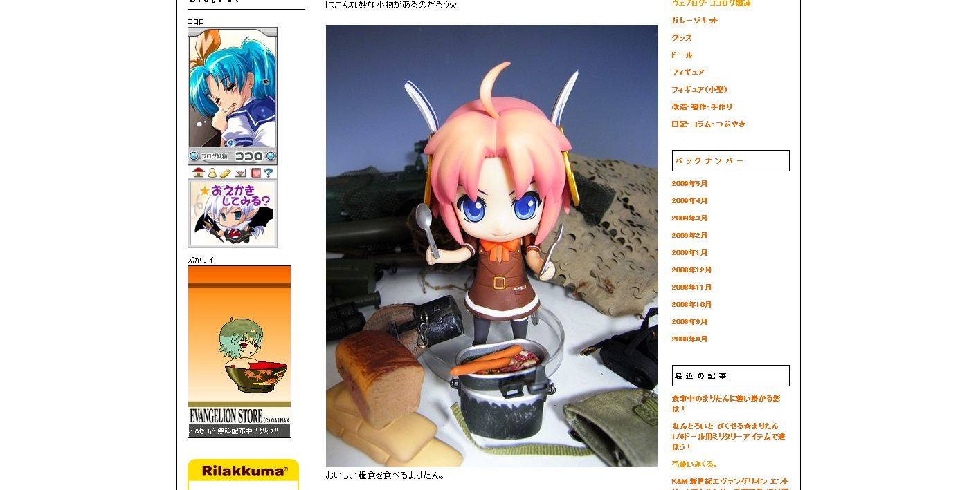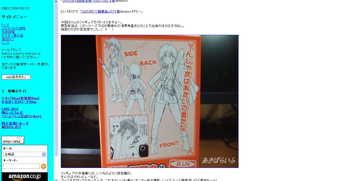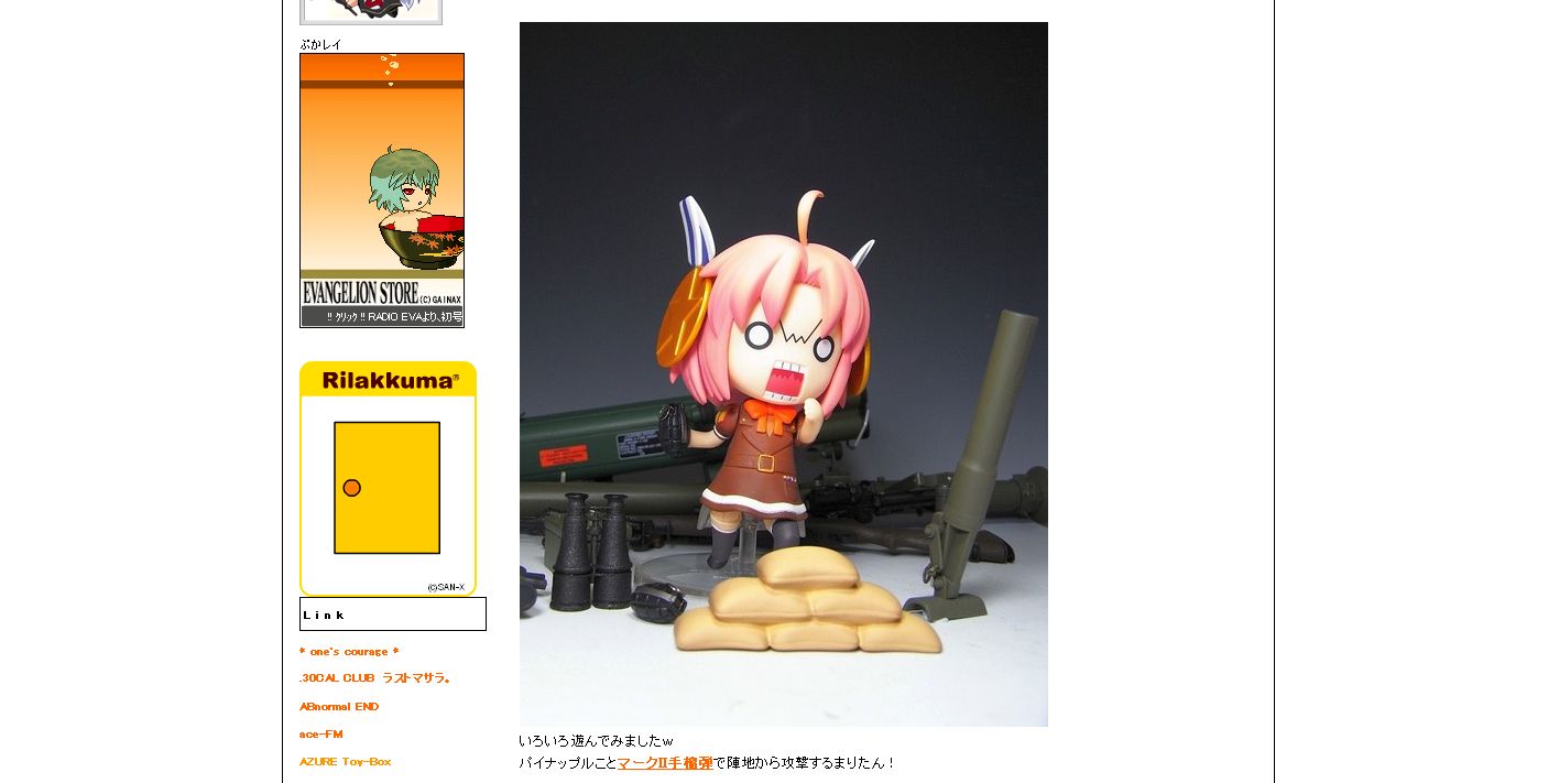 ~要約~ 写真使いすぎなんじゃ~! 周りのことも考えんかい、ボケナスぅ! ~以上、要約終わり~ ・・・そんなに使った記憶は無いんだけれど。管理者がそう言うんなら、そうなんかなぁ~? んで、しょうがなく、いろいろ調べてみて、 †ボーダーライン@玩具堂†さんが使用していると思われる、 フォト蔵ってところを試してみることに。 さて、どうなることやら。 巡回 しょんぼり倶楽部さんが相互リンクしてくれました! ありがと~!ありがと~! ゜*。(*´Д`)。*° 正直、少し前に勝手にリンクしていたので、怒られるのではないかと 内心ビクビクシテマシタ。 お優しきお言葉で許可いただき、本当にありがとうございます! たいたんnoページさんでは 100万HIT達成されたそうです! おめでと~!おめでと~! さらに、 さんも こたつねこのドールねっと 「感謝×10万」 10万HIT達成されたお知らせが!オメデト~!オメデト~! ここのところ、リンクさせていただいている皆さんが続々と 莫大な数のHIT数のご報告が。 ウチでも、目標は高く、でも、ゆっくりマッタリと歩んで行けたらいいなぁ。 hobby-toy-webさんでは ねんどろいど ぴくせる☆まりたん 1/6ドール用ミリタリーアイテムで遊ぼう! 食事中のまりたんに襲い掛かる影は! まりたん活用法、その1とその2。 ミニタリー物は大きさや種類が豊富にあるので、 いろんな組み合わせが出来そうですね。 でも、基礎知識が必要・・・・ orz GEORGIA×crocs “おでかけ”マスコットキーホルダー ドールサイズな精巧ミニチュアサンダル! ![]() イリヤさんが、おっきめなサンダルを履いて・・・・なんて妄想が。 シューズ物のオマケって片足だけって多いですよね。 萌特化書店員さんでは、 コトブキヤ 柚原春夏 .レビュー「こんな人とお隣さんだったら僕はもうっ・・・!」 さすが、春夏さん。人妻とは思えませんねぇ。 他の現役学生と並べて飾っても全く見劣りしなさそう。 AZURE Toy-Boxさんでは、 di:stage 発表説明会 レポート ![]() di:stage 発表説明会のレポですね。 倍率約五倍の狭き門をくぐられてのレポは貴重です。 “何もしない”という贅沢 ![]() 最近の私の夢かも。 真昼間に何もせず芝生で日向ぼっこ。 子供の頃は何気なくしていたことが、今現在ではなかなか出来ないですよね。 ミクの何も考えずに寝転んだ表情が・・・・・うらやましいです。 |