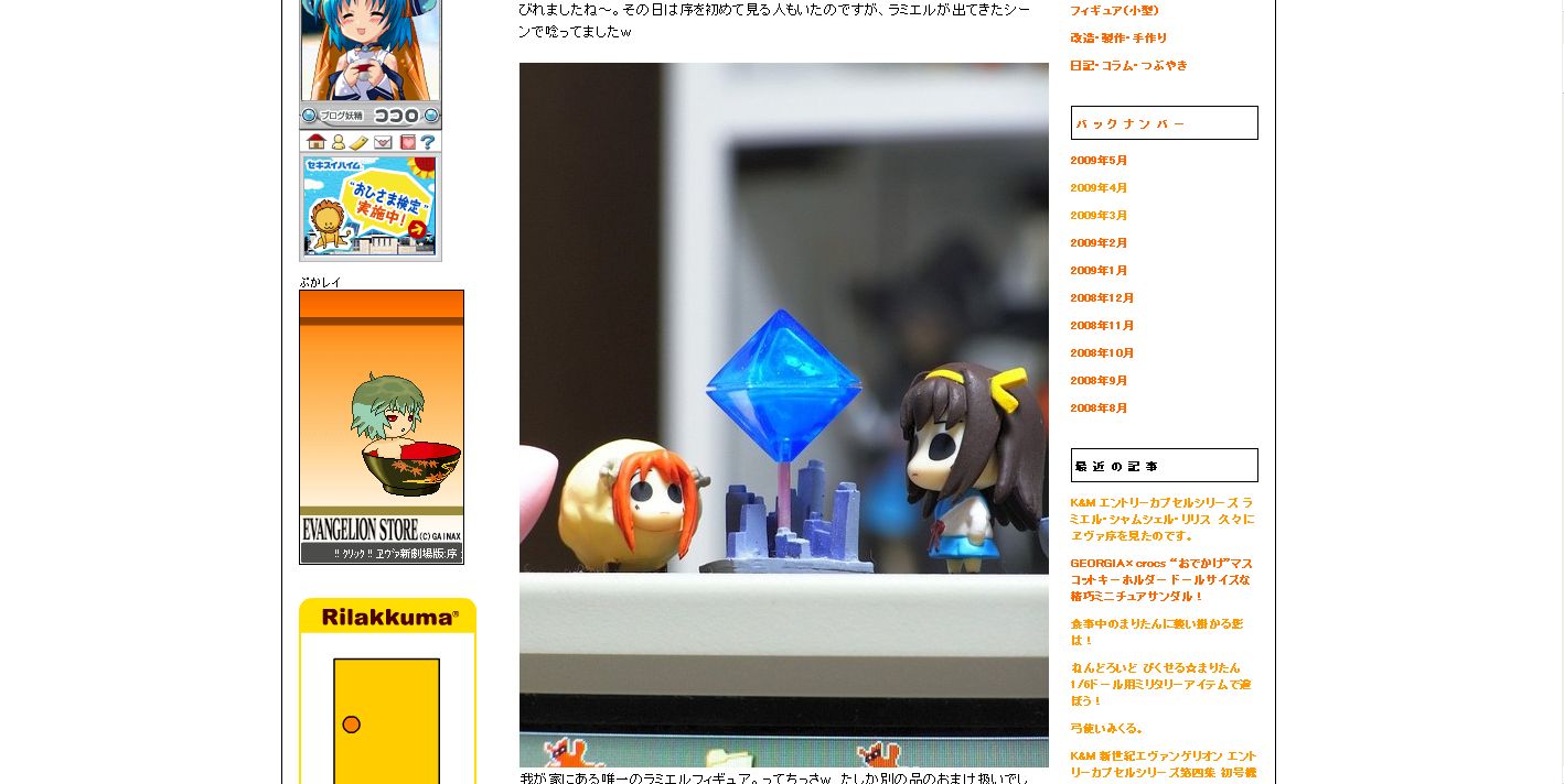 「おかしいですよ、カテジナさん!」 と叫びたくなる生活ですね。 【オカシイノハワタシノアタマノナカデス。】 こんな発売日がたて続けの一番嬉しい頃のはずなのに、 休みがなかなか取れないなんて・・・。 il||li(つд-。)il||li 今日も仕事場で軟禁状態。でもアムロ並みに抜け出してやるんだからねっ! 明日こそは自由な時間が多く取れるといいなぁ・・・。 いろんな事に手を出しすぎ? うん、解かってはいるんだけどね。 巡回 hobby-toy-webさんでは、 K&M エントリーカプセルシリーズ ラミエル・シャムシェル・リリス 久々にヱヴァ序を見たのです。 こなた!逃げてぇぇぇぇ! ヱヴァンゲリヲンもそろそろ「破」が公開間近のようですね。 私は「序」のDVDを買っちまったんですが、 Blu-Rayに鞍替えするか、DVDのまま押し通すのか迷っています。 う~ん・・・・どうしよ・・・・。 笹の葉ラプソディは今夜! 関東圏ではハルヒ新作で盛り上がってるようですね。 名古屋圏は・・・・約1週間遅れ・・・・orz †ボーダーライン@玩具堂†さんの5月22日の更新でも 放送内容のレビューが。 どうして東海圏内は地上波オーラス放送日なアニメが多いのかと・・・・。"o(>ω< )o"ヤダヤダ あきばらいふさんのところでは、5月21日の記事では 「ながされて藍蘭島」15巻限定版のりんフィギュアレビューが! このシリーズは少々小さめながら手を抜かないシリーズですよね。 でも、一度購入が途切れちゃってるとなかなか購入する気力が・・・・。 確か、フィギュア限定版が始まった当時は、 「天正やおろず」もフィギュア化してたんだけどな~。 あっちがその後進展なしだったのでその後購入してないです。 orz 萌特化書店員さんのところでも コトブキヤ ながされて藍蘭島 りん(ながされて藍蘭島15巻限定版)レビュー レビューが。 こちらのサイトでも評価が高いなぁ。 なんてこったい。