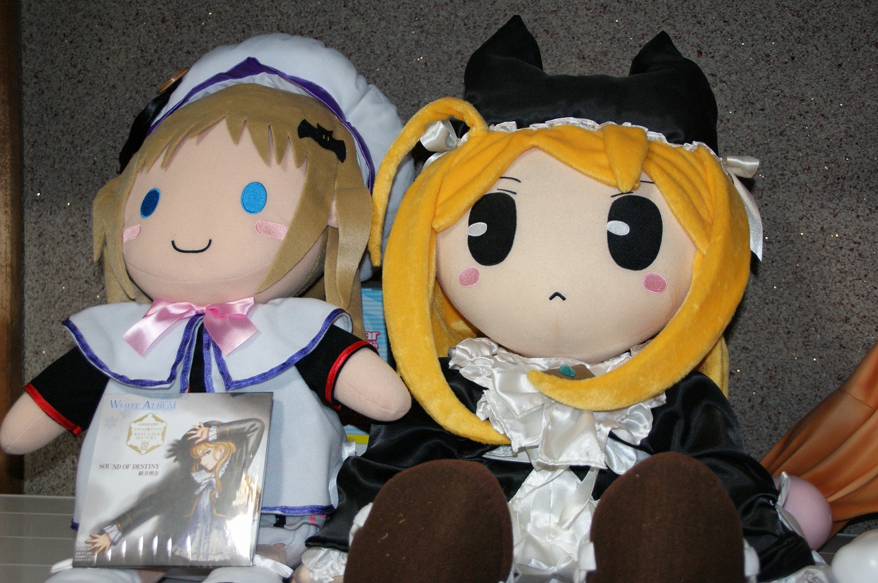 すると、 店舗の片隅で、ダンボールの中に入り、まるで捨て猫のように泣いている娘さんがいました。 「わふぅ、わふぅ。」 つい不憫に思い、何も考えず連れ帰ってました。 それが、この娘。「ぬいぐるみクドリャフカ」 ようこそ、我が家へ。 ちょっと大きい娘だけれどなんとか飾りましょ~。ということで、 いままで一人で寂しそうにしていた「リースたん」のお友達になってもらうことにしました。 並んで鎮座するとマタマタ和むくうかんだなぁ。