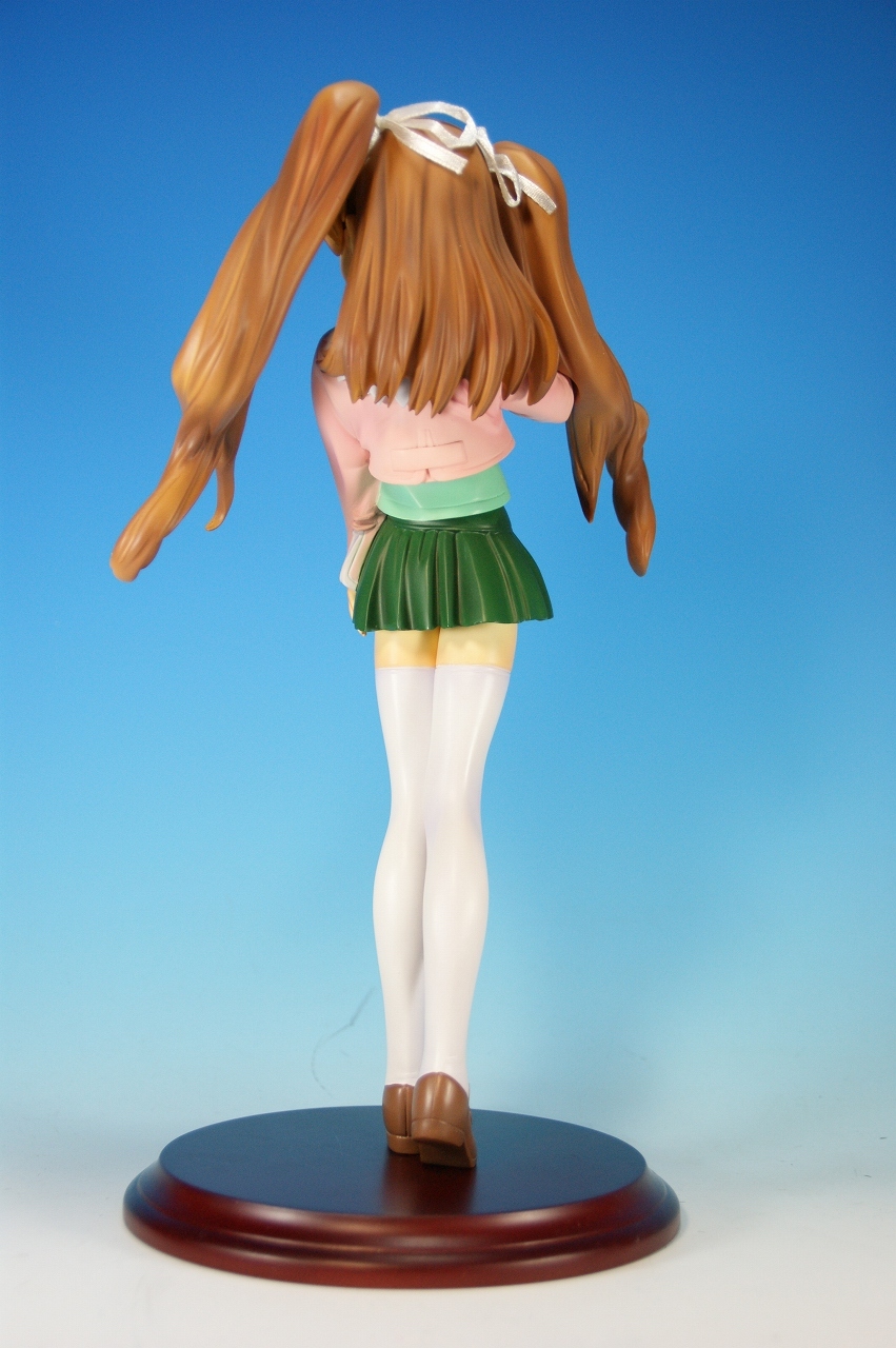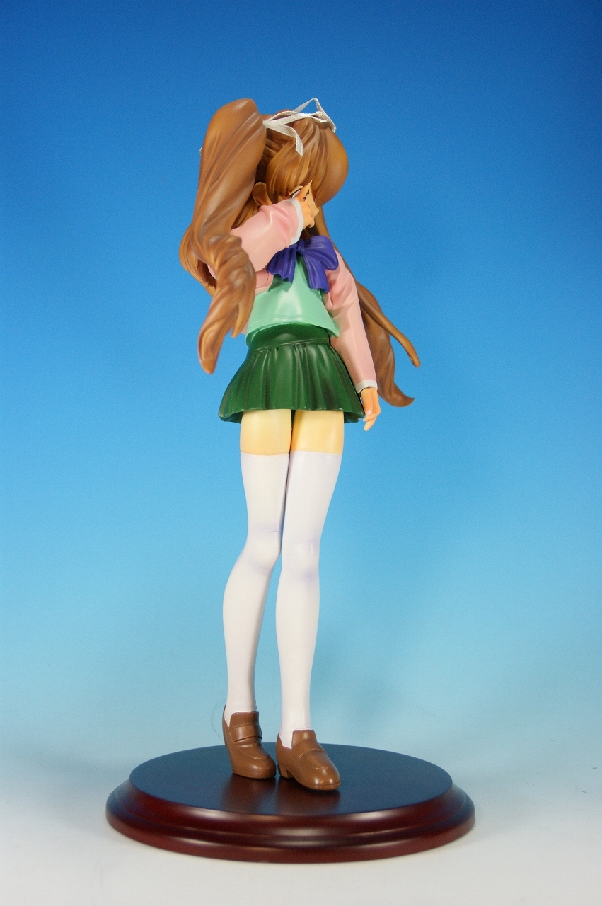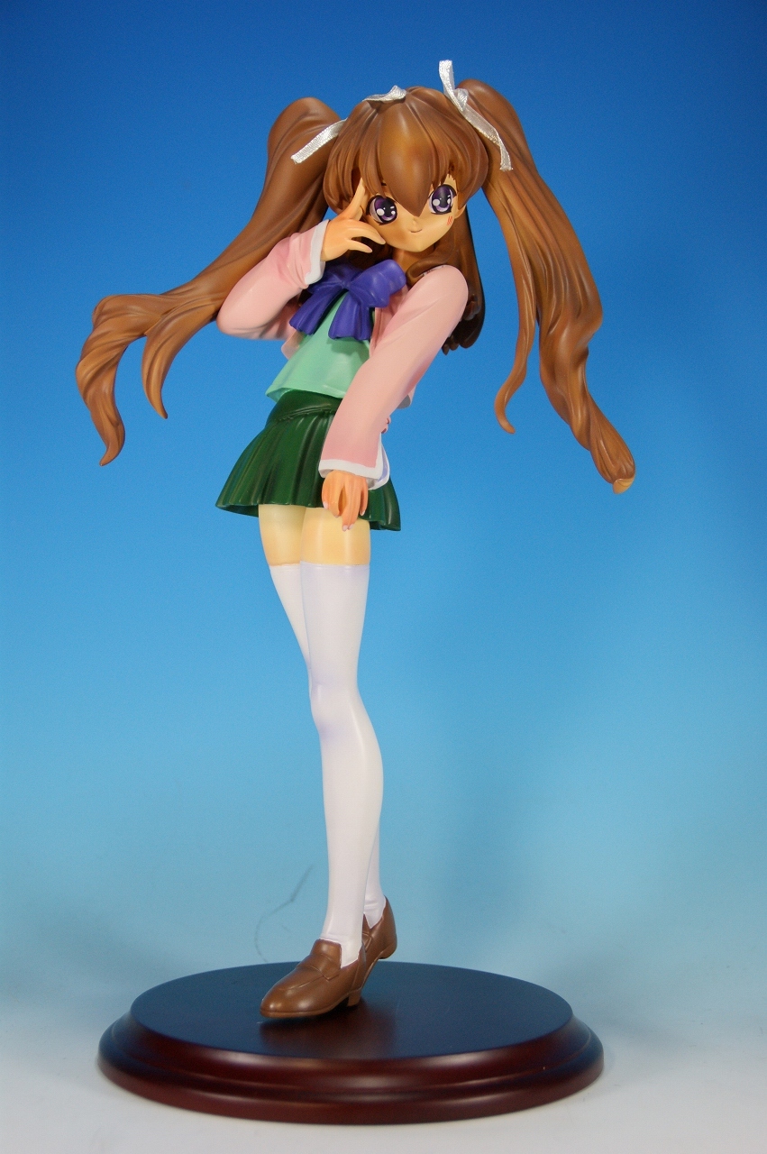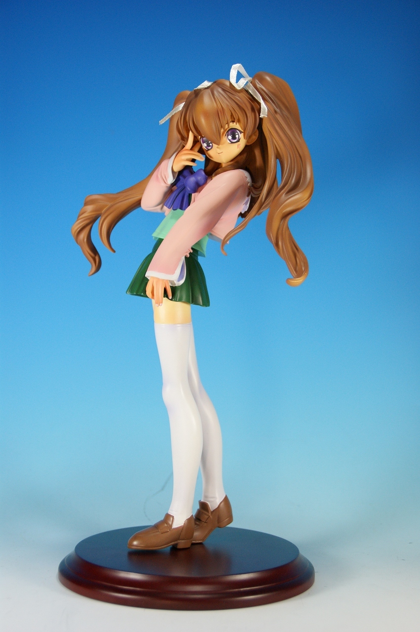この娘は2008年に開催された「クレイズ萌え~ろ祭」で発売されたようです。 原型師は「みすまる☆ましい」氏ということで、前回の好イメージのため 大須の中古屋に鎮座されていたところを即査収。 外箱は、 白い木箱です。ゲームタイトルが金色で箔押ししているようです。 この箱自体も紙の箱に入っていたのですが、保存状態が悪いため (中古のため)割愛。 開けてみると、 こんな感じ~。新品じゃないので雰囲気だけでも。豪華に感じます。 では、ぐるりと一周。 愛沢ともみと言えばツインテール。このボリューム感がとても目を引きます。 また、動きが少ないポーズの中で、あどけない愛らしさがにじみ出ています。 ちょっとアップで。 手の甲が半分隠れる袖が、とても良い感じ。 リボンが布製なので、個人個人で調整が必要かも。 指や手が、 造型が甘い上、妙に赤味かかっていて大変残念。 造型はまだしも色味がコレだけ違うのは・・・。 足元は結構よい造り。 ウェーブ版と並べてみると、 同じ人の作品で、同じモチーフでも違いが出るので面白いです。 以上、 「クレイズ 愛沢ともみ 私服版」でした~。 細かいところに粗はありますが、「みすまる☆ましい」氏のともみ嬢はとても愛らしいですね。 今回、中身未確認で、原型師名義のみ、知識なしの購入に踏み込みましたが、結構満足。 今までは店頭パッケージやHPの写真なんかで見ながら感性で購入してましたが、 これからは、原型師さんをもっと注目してみようかな。同じ結果かもしれないけどね。